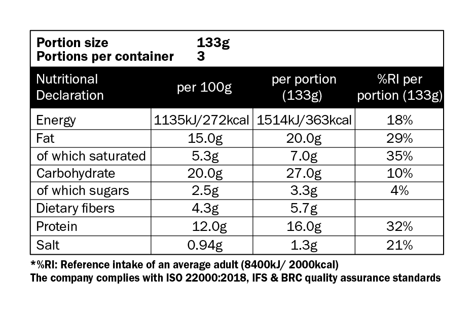 At the same time the high protein index derived from pea protein (soy-free) and exceeds 16g in combination with edible fibers that reach 5.7g fills you with energy! A meal that makes no retreat in nutrients and taste for a complete alternative diet filled with rich valuable elements for our body.
