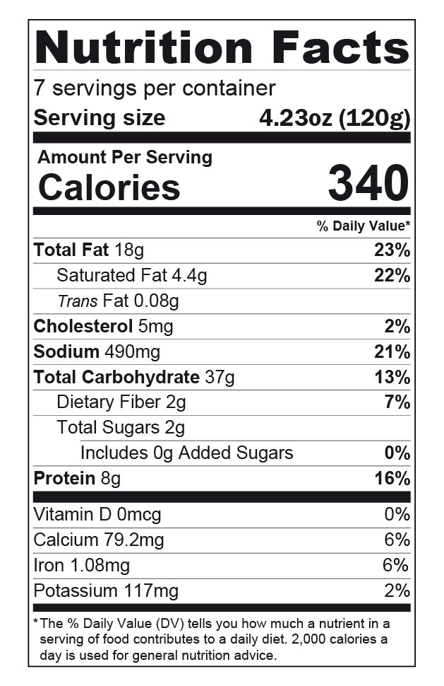 Spinach 40%, onion, whey cheese (mizithra) 15%, mixture of vegetable oils (corn oil, olive pomace oil, sunflower oil), breadcrumbs wheat [wheat flour, water, whole wheat flour, rye flour, yeast, salt, barley malt flour, sugar, emulsifier (diacetyltartaric and fatty acid esters of glycerol), antioxidant (ascorbic acid)], pasteurized egg, modified starch, feta cheese P.D.O. 2%, salt, dill, garlic powder.