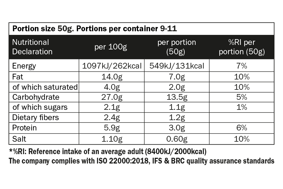 Spinach 42%, onion, whey cheese (myzithra) 8.5%, feta cheese P.D.O. 8.5%, mixture vegetable oils (corn oil, olive pomace oil), breadcrumbs wheat [wheat flour, water, whole wheat flour, rye flour, yeast, salt, barley malt flour, sugar, emulsifier (diacetyltartaric and fatty acid esters of glycerol), antioxidant (ascorbic acid)], pasteurized egg, salt, dill, garlic powder.
